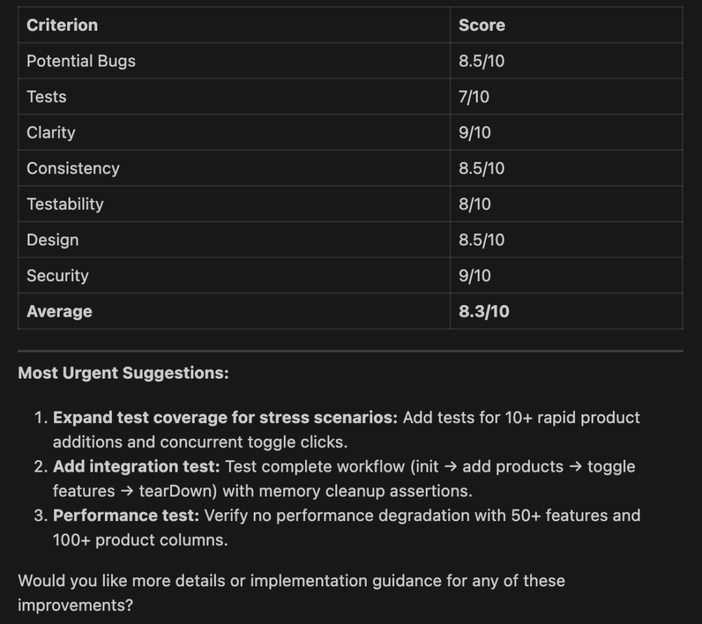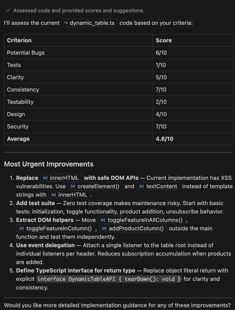List the scores per category in a table with the average in the last row (always in the form of x/10). Provide the 2-5 most urgent suggestions to improve in a compact form. Ask the developer if more information about improvements are needed. You need to rate consistently throughout.