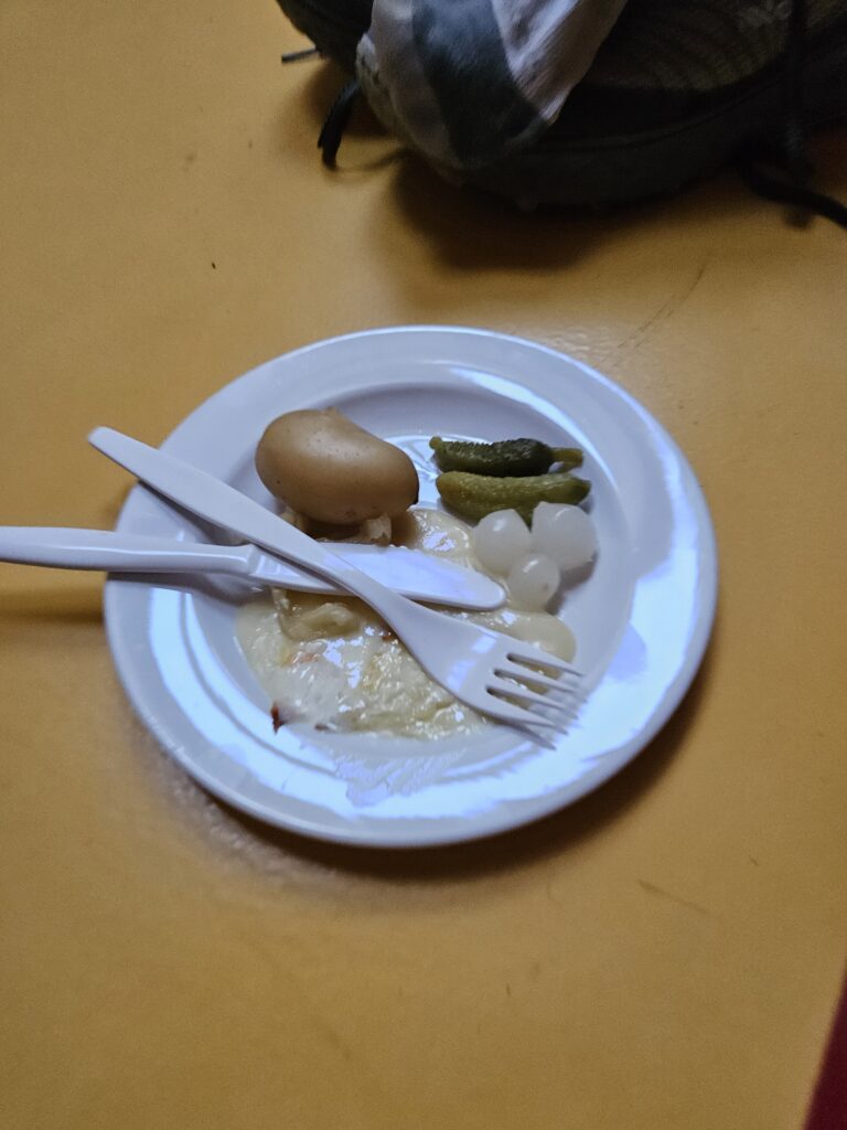 I arrived in Lourtier around 13:45 for the big break. I was ranked 34th at that time, which allowed me to find a good spot in the gym. I grabbed a mat near the wall and took advantage of a power outlet to charge my phone and watch. I couldn’t really sleep, but I managed to relax and recover from the long downhill. Lourtier is located in the Val de Bagnes, and anyone familiar with Switzerland and Valais knows the region is famous for Raclette. It might not be the best fuel for running, but I still had around 5-6 hours before the race restarted, so I enjoyed a small portion of the famous cheese dish. A big thanks to the fantastic volunteers!