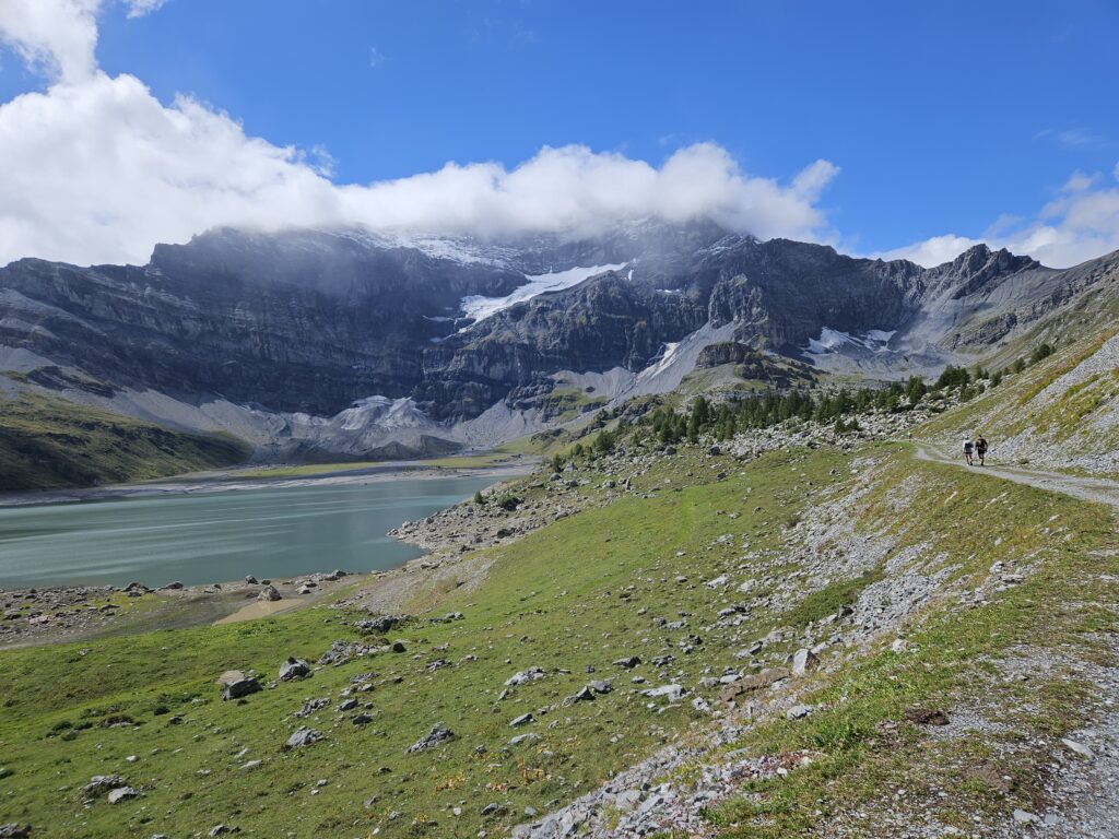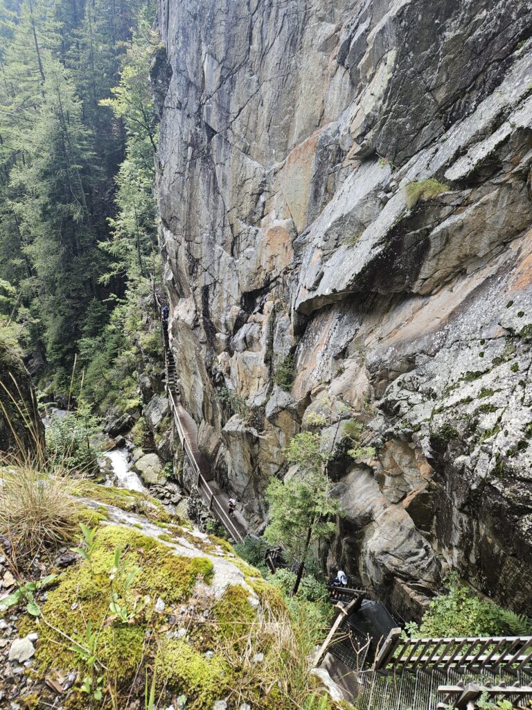 A large part of the climb consisted of stairs – a surprisingly welcome change. It offered a break from the usual climbing and allowed different muscle groups to work. I switched both poles into one hand and used the other to steady myself on the rail. At times, it felt almost canyon-like, with water rushing underneath. Eventually, the stairs gave way to a double track, and a few minutes later, I reached the Auberge de Salanfe aid station – a large building with a small aid station tucked away on the ground floor.