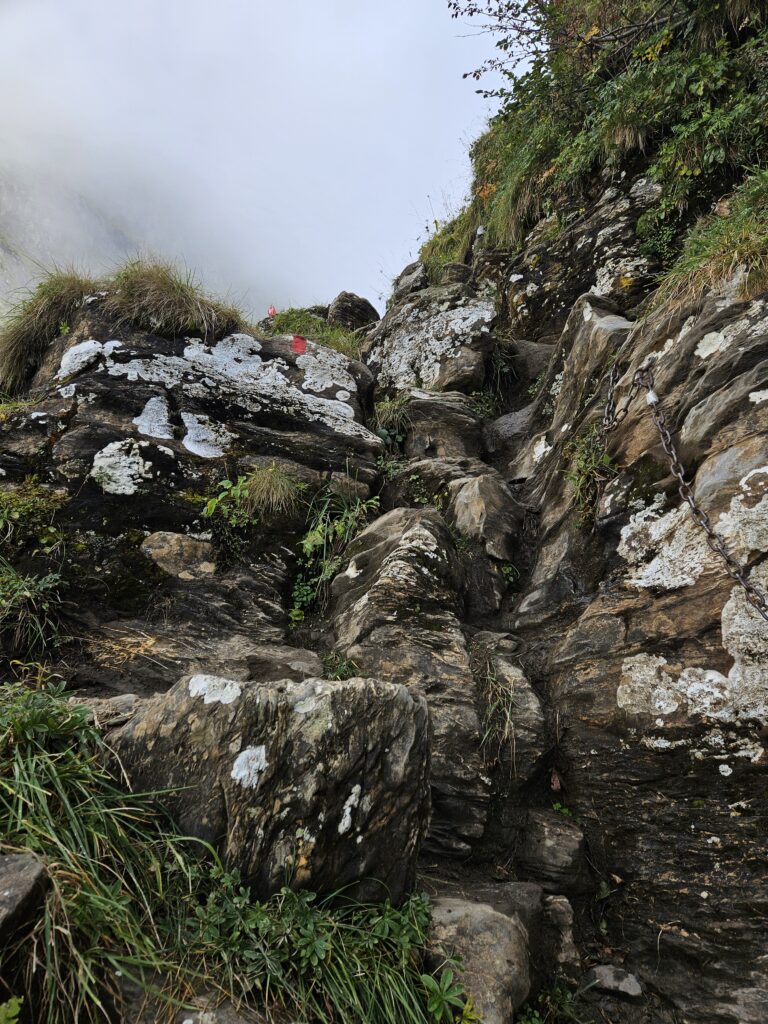 The downhill that followed proved difficult again. I fell once, hitting my elbow, and while it wasn’t serious, it definitely rattled my concentration. After the downhill, I slogged through some muddy terrain before finally reaching the Barme aid station at 102km. I took a fifteen-minute break, but I was shivering a bit and my nutrition wasn’t sitting well the last hour. I sent a few messages to those supporting me, then planned to push on to Morgins, the second life base 20km away, hoping for a longer break to replenish my energy. Easier said than done. As you can see in the pictures below, the terrain wasn’t letting up. The slowest section was probably the downhill secured by chains.