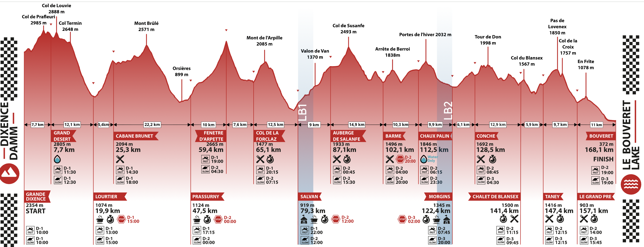 It had started to rain on the dam, but it stopped a few minutes before the start. The organizers then explained again the reasons for the stop in Lourtier. They could have merged us with the 100km runners, but they wanted to give us the full 100-mile experience – and that’s what we signed up for! Everything has been well organized and clearly explained so far.