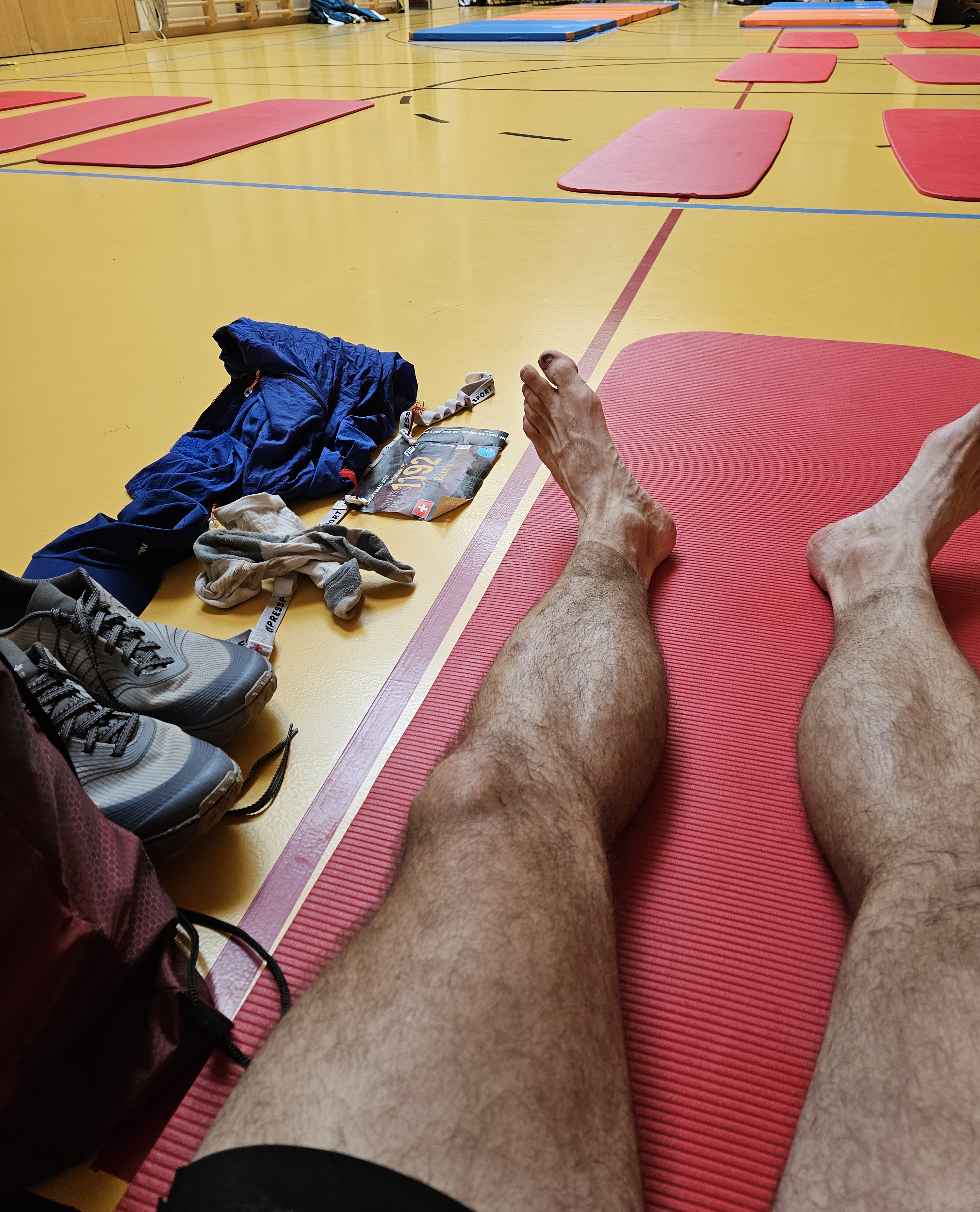 I promised myself I’d run this section. It would have been beautiful in daylight – the path followed a river, and we crossed small bridges seven or eight times. Around 21:00, I finally reached the life base in Morgins, after what felt like an eternity. My watch showed over 122km, which had made it harder, as I was expecting the base to appear shortly after the 122nd kilometer. Anyway, now it was time for a break. I ate rice with vegetables and tried to calm down, then planned to sleep for 40 minutes. I took my sleeping bag from the drop bag and headed upstairs with my phone and the alarm set. In one of the rooms, I found an empty bed. Only one other runner was in the same room – probably one of the 380 or 700km Swiss Peaks competitors. He was sleeping. I didn’t want to disturb him and quietly settled into my sleeping bag. Simply lying down was helping. I don’t know how much deep sleep I actually got – maybe ten minutes – but lying flat and releasing the pressure on my legs for forty minutes felt amazing! I got up and went downstairs for a coffee.