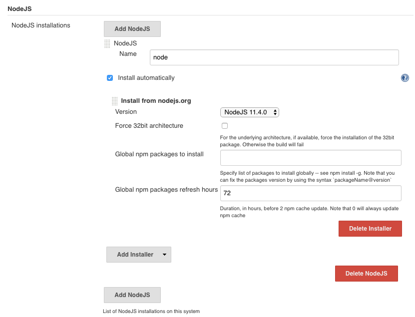 Next, we navigate to “Manage Jenkins” → “Global Tool Configuration” and make sure that a node version is installed and configured: