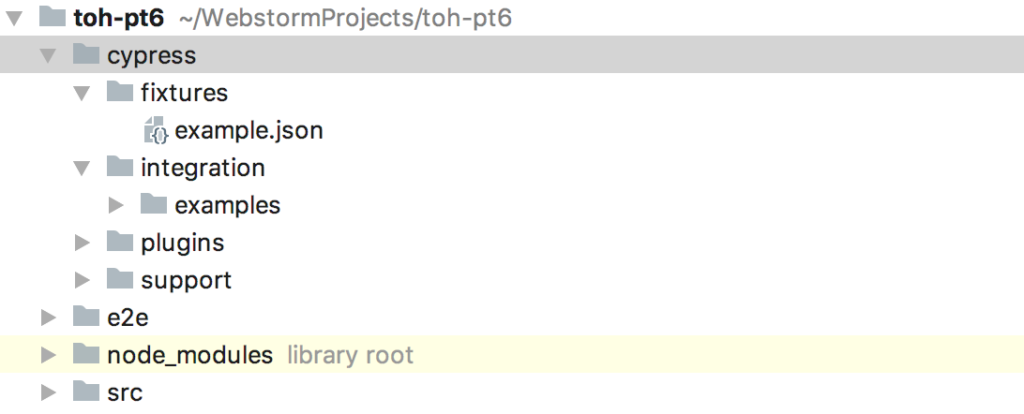 This command not only installs the Cypress node package but also creates a “cypress” directory in our Angular project. Within that directory we find examples for fixtures and tests amongst other stuff. The “integration” directory is the one wherein we write our tests later.
