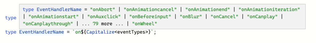 Let’s assume we have the HTML events like click, enter, etc. And we want to have a type for strings like ‘onClick’, ‘onEnter’, etc. A first approach could look like this: